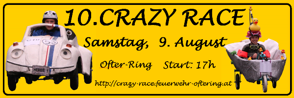 10 Jahre CRAZY RACE in Oftering - 10x kreative Seifenkisten - 10x tollkühne Piloten - 10x tolles Publikum! Doch das Jubiläumsrennen wird als einzigartig in die Geschichtsbücher eingehen. Unter den Piloten kam nur kurz Unruhe ob des Regenschauers während des Rennens auf und der damit erforderlichen Änderung der Reifenstrategie. Doch das tolle Oftering Publikum nahm den kurzen Schauer ganz gelassen und hielt den Piloten die Treue und erlebte so einzigartige Läufe! VIELEN DANK AN DAS REGENFESTE OFTERINGER PUBLIKUM!