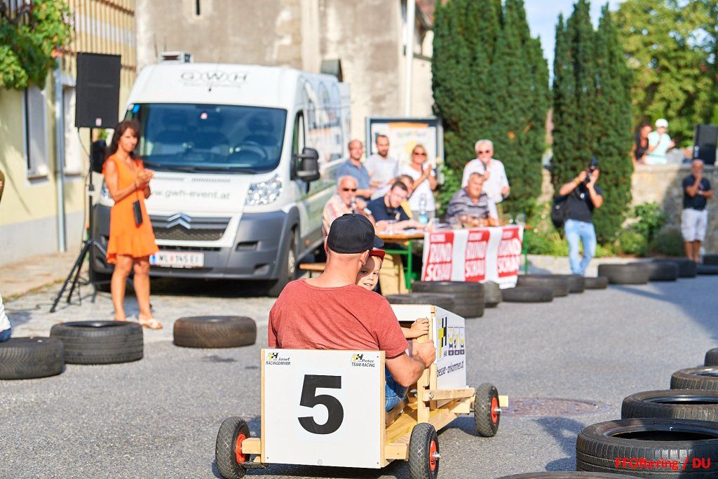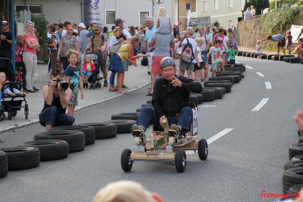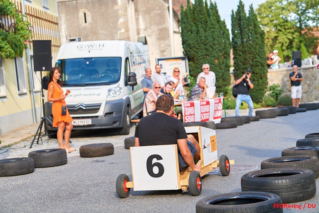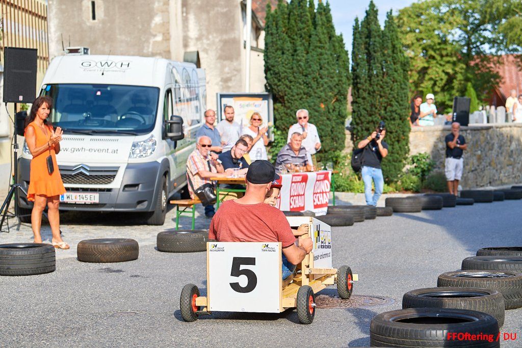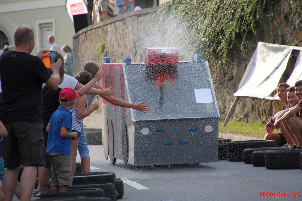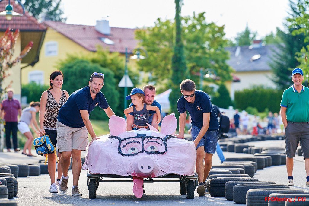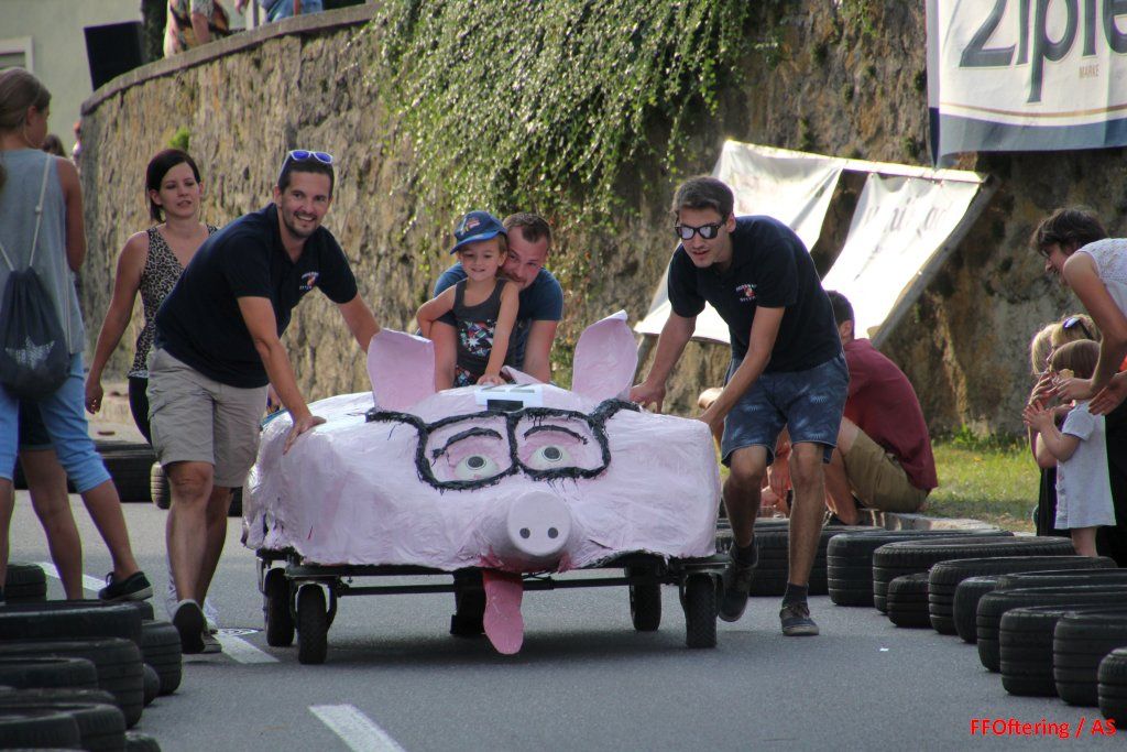Das Rennen selbst verlief ohne größere Komplikationen. Eine Kiste erreichte das Ziel aufgrund eines technischen Gebrechens leider nicht. Da aber grundsätzlich die Punkte der Jury zählen, war das kein Problem. Der Bolide rund um das Team "Die Sau" von unserem Fleischhauer Michi, konnte dank der Hilfe des Publikums nach über 6 Minuten die Ziellinie doch noch erreichen. Ein Gefährt in Form eines Schweines und ein Fleischhauer als Fahrer, sind vielleicht keine glückliche Kombination.