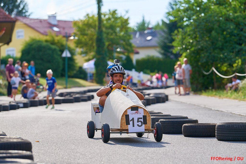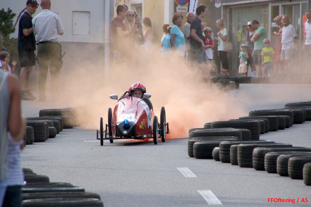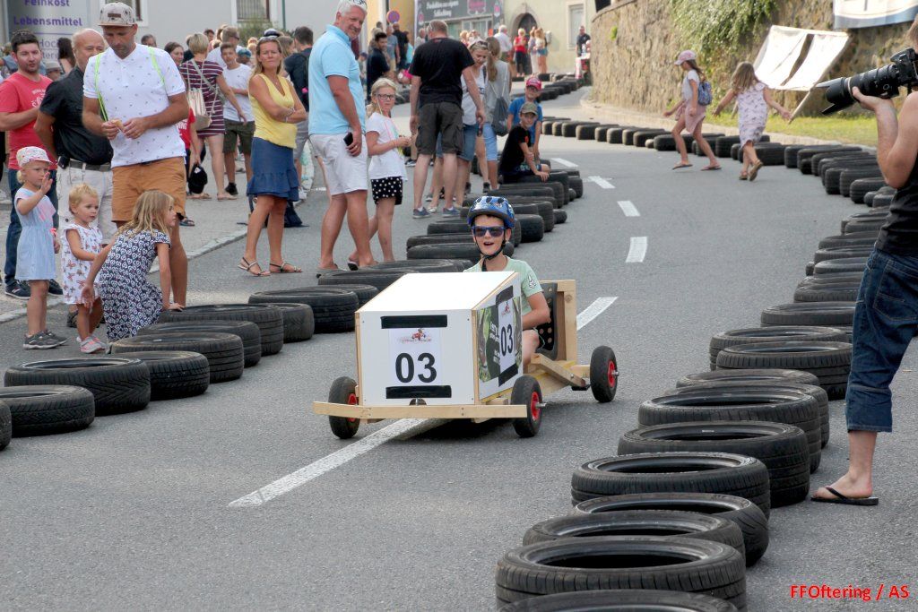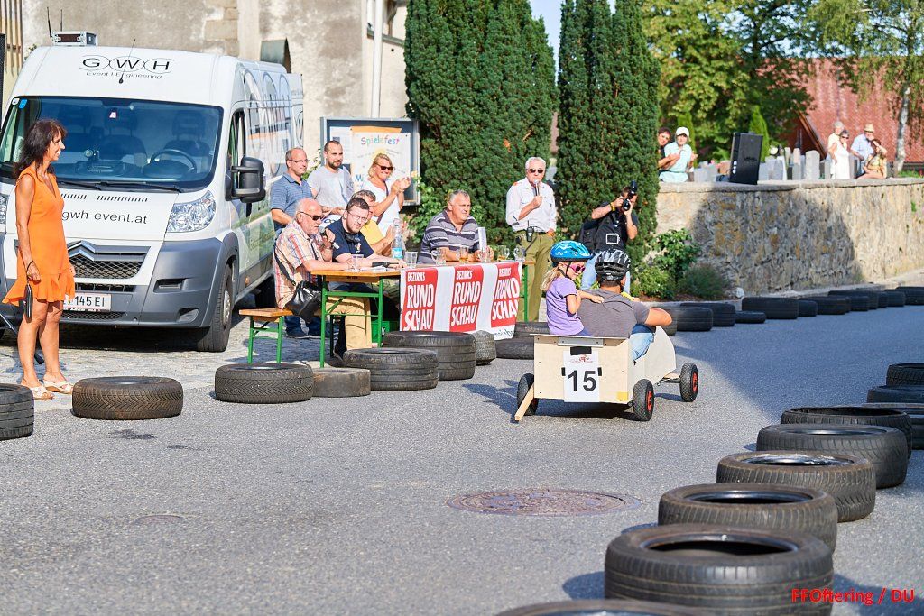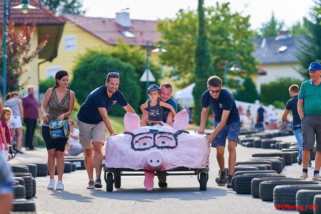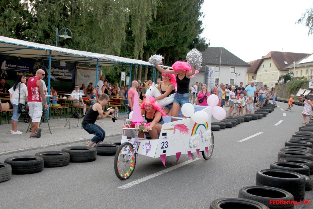 Das Rennen selbst verlief ohne größere Komplikationen. Eine Kiste erreichte das Ziel aufgrund eines technischen Gebrechens leider nicht. Da aber grundsätzlich die Punkte der Jury zählen, war das kein Problem. Der Bolide rund um das Team "Die Sau" von unserem Fleischhauer Michi, konnte dank der Hilfe des Publikums nach über 6 Minuten die Ziellinie doch noch erreichen. Ein Gefährt in Form eines Schweines und ein Fleischhauer als Fahrer, sind vielleicht keine glückliche Kombination.