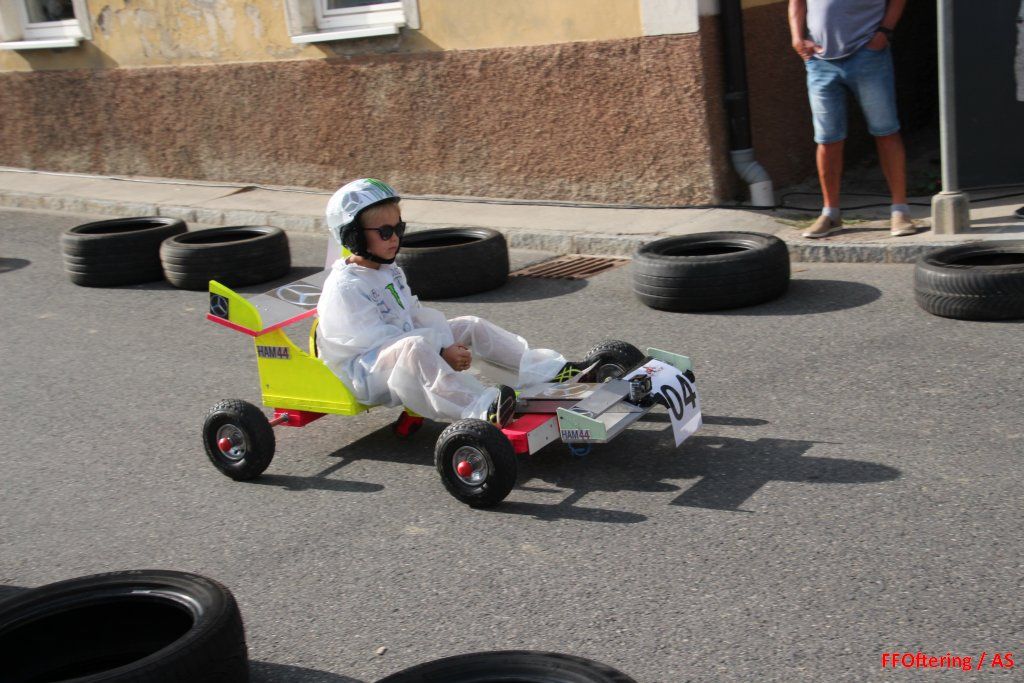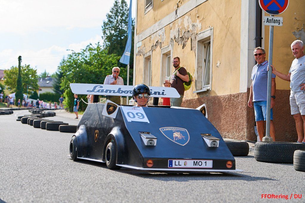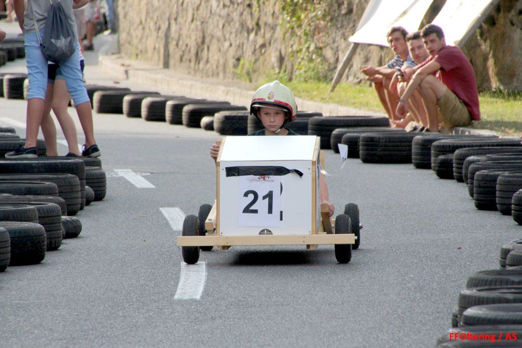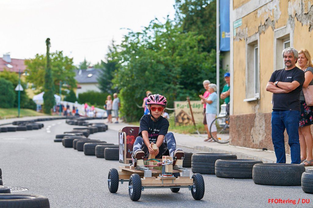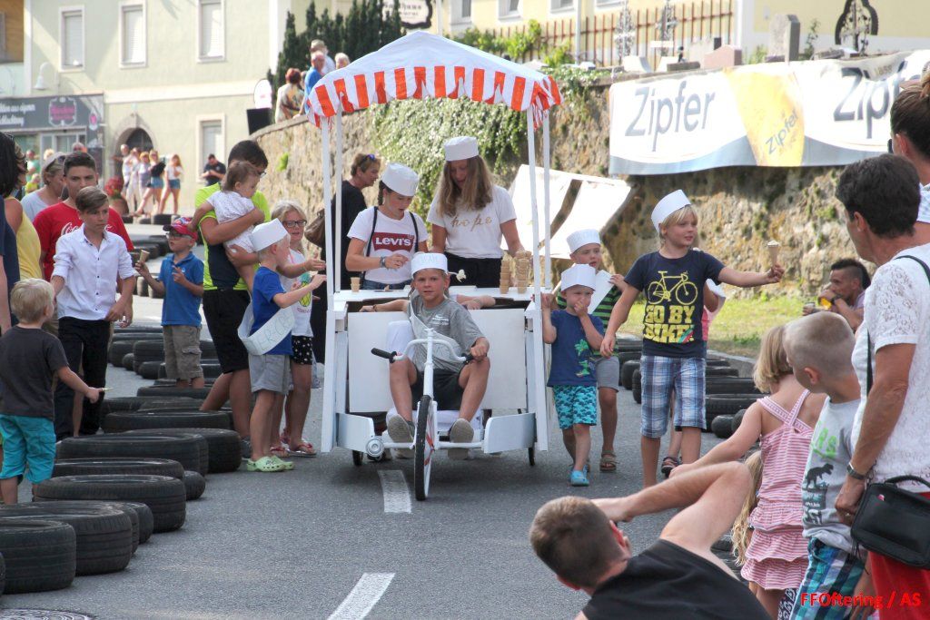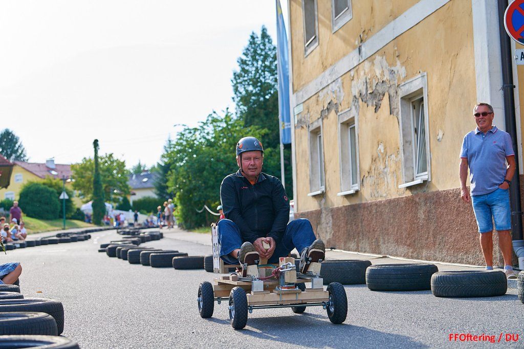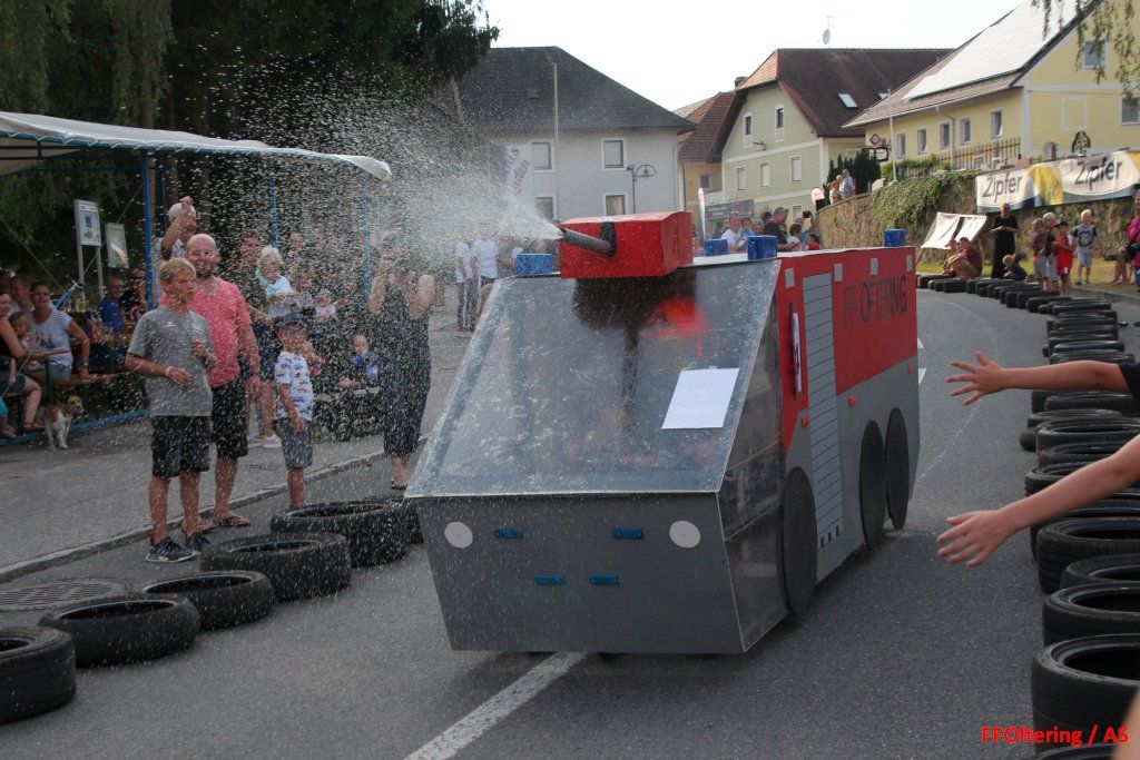 Das Rennen selbst verlief ohne größere Komplikationen. Eine Kiste erreichte das Ziel aufgrund eines technischen Gebrechens leider nicht. Da aber grundsätzlich die Punkte der Jury zählen, war das kein Problem. Der Bolide rund um das Team "Die Sau" von unserem Fleischhauer Michi, konnte dank der Hilfe des Publikums nach über 6 Minuten die Ziellinie doch noch erreichen. Ein Gefährt in Form eines Schweines und ein Fleischhauer als Fahrer, sind vielleicht keine glückliche Kombination.