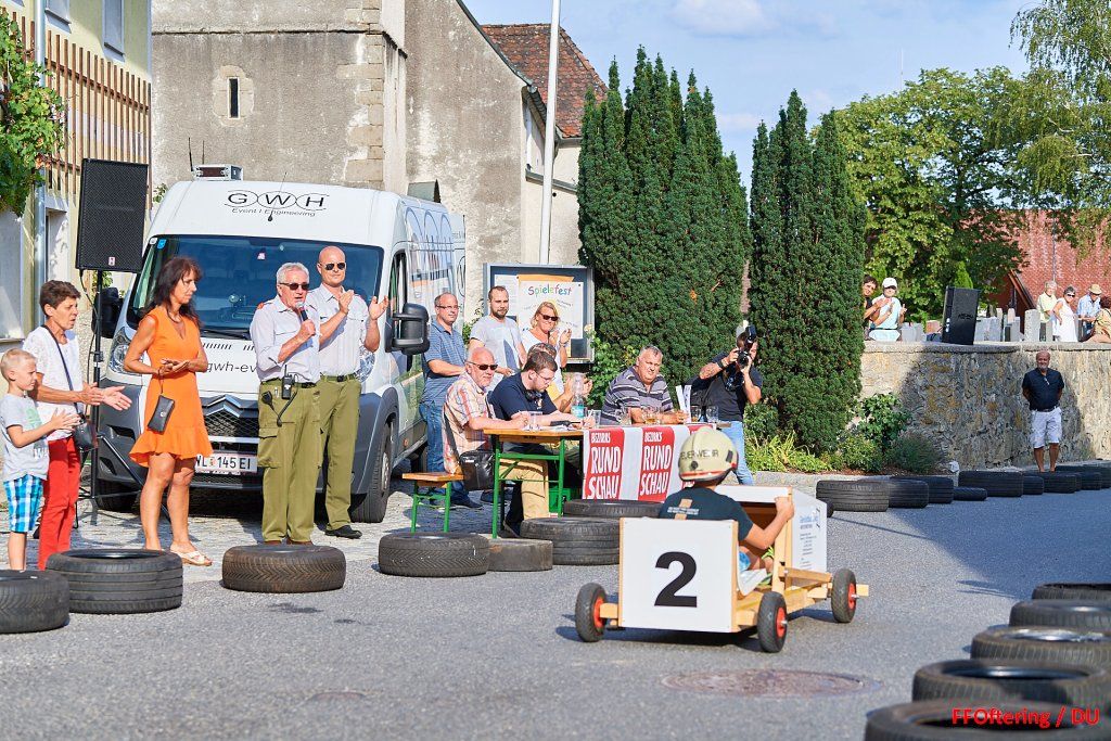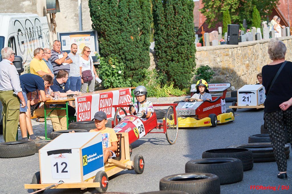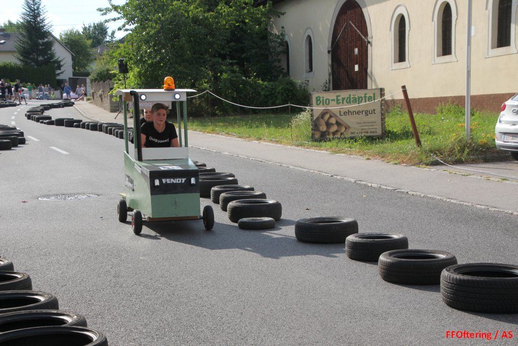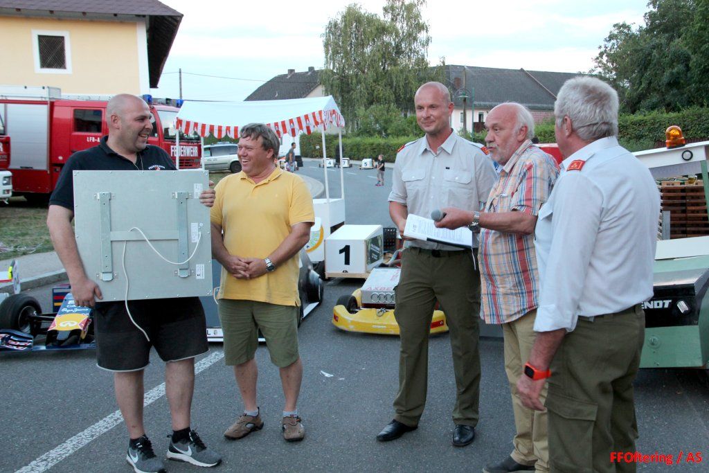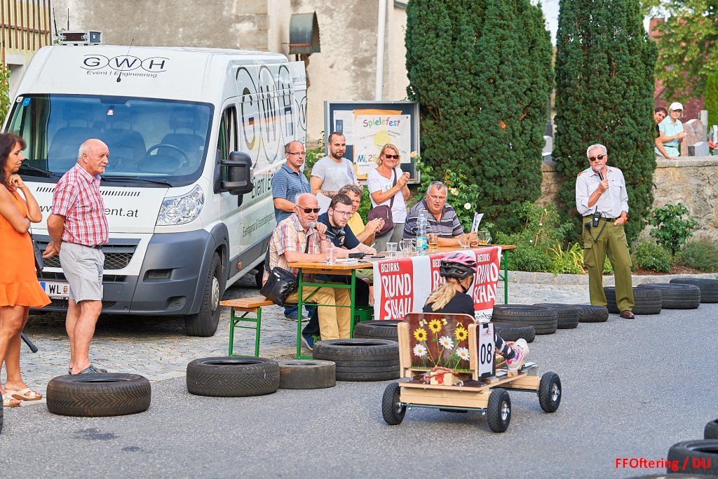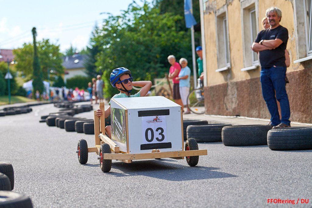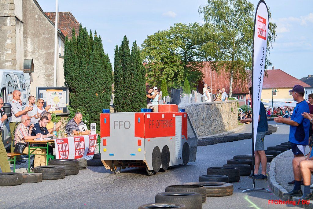 Das Rennen selbst verlief ohne größere Komplikationen. Eine Kiste erreichte das Ziel aufgrund eines technischen Gebrechens leider nicht. Da aber grundsätzlich die Punkte der Jury zählen, war das kein Problem. Der Bolide rund um das Team "Die Sau" von unserem Fleischhauer Michi, konnte dank der Hilfe des Publikums nach über 6 Minuten die Ziellinie doch noch erreichen. Ein Gefährt in Form eines Schweines und ein Fleischhauer als Fahrer, sind vielleicht keine glückliche Kombination.