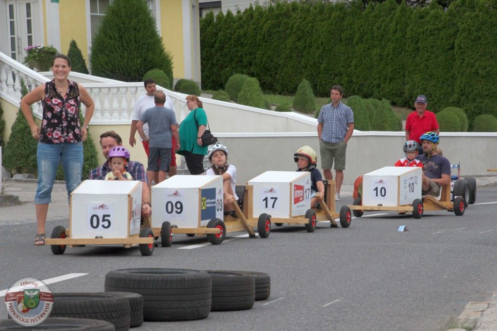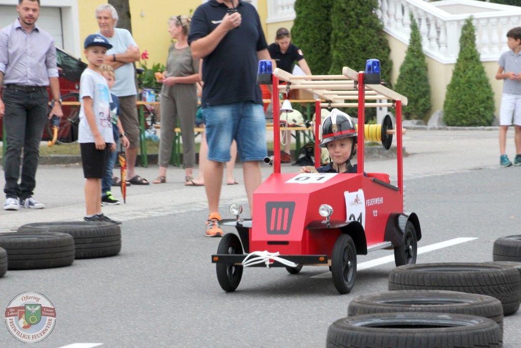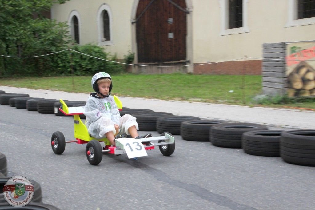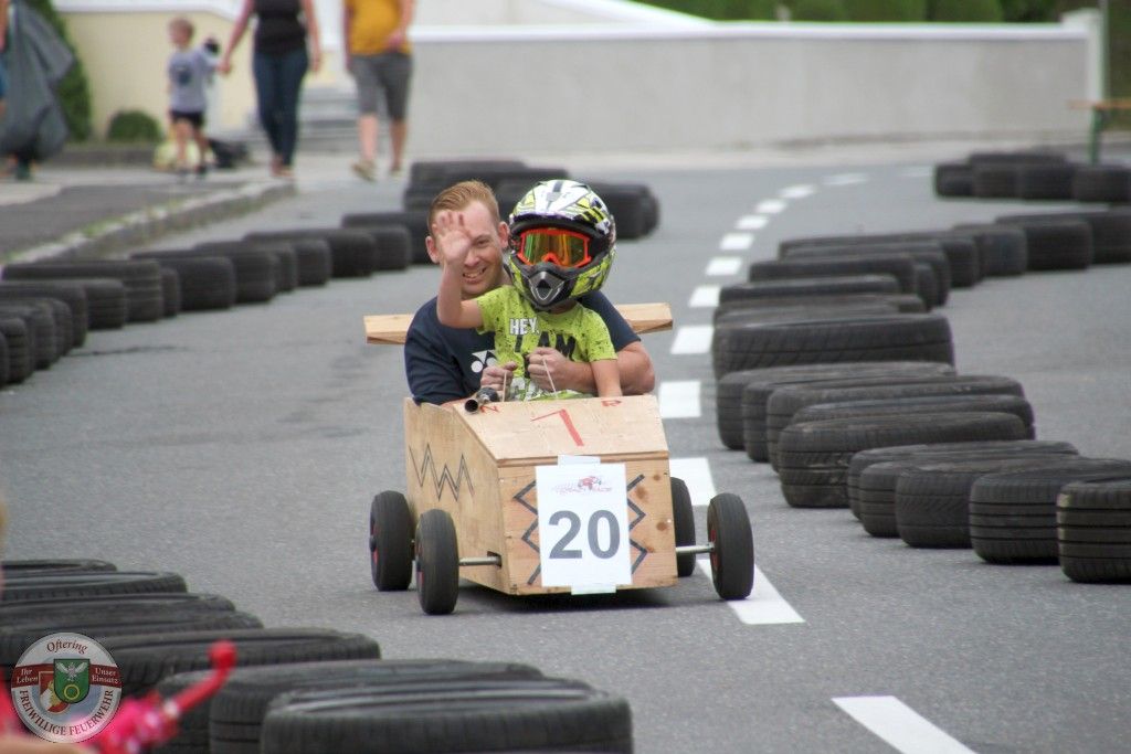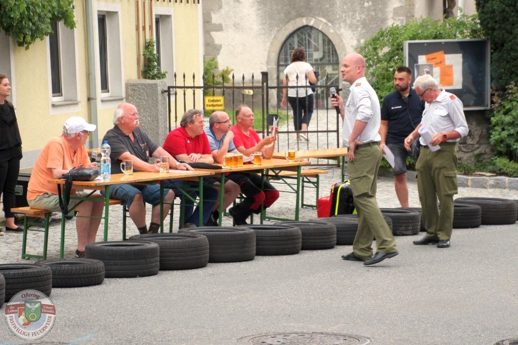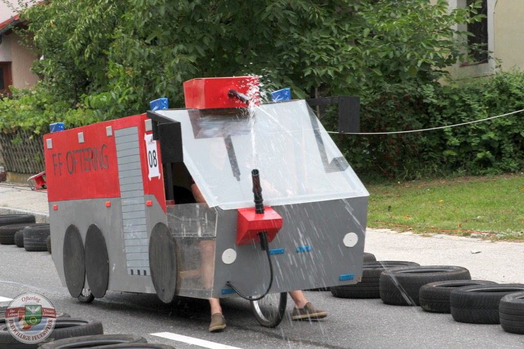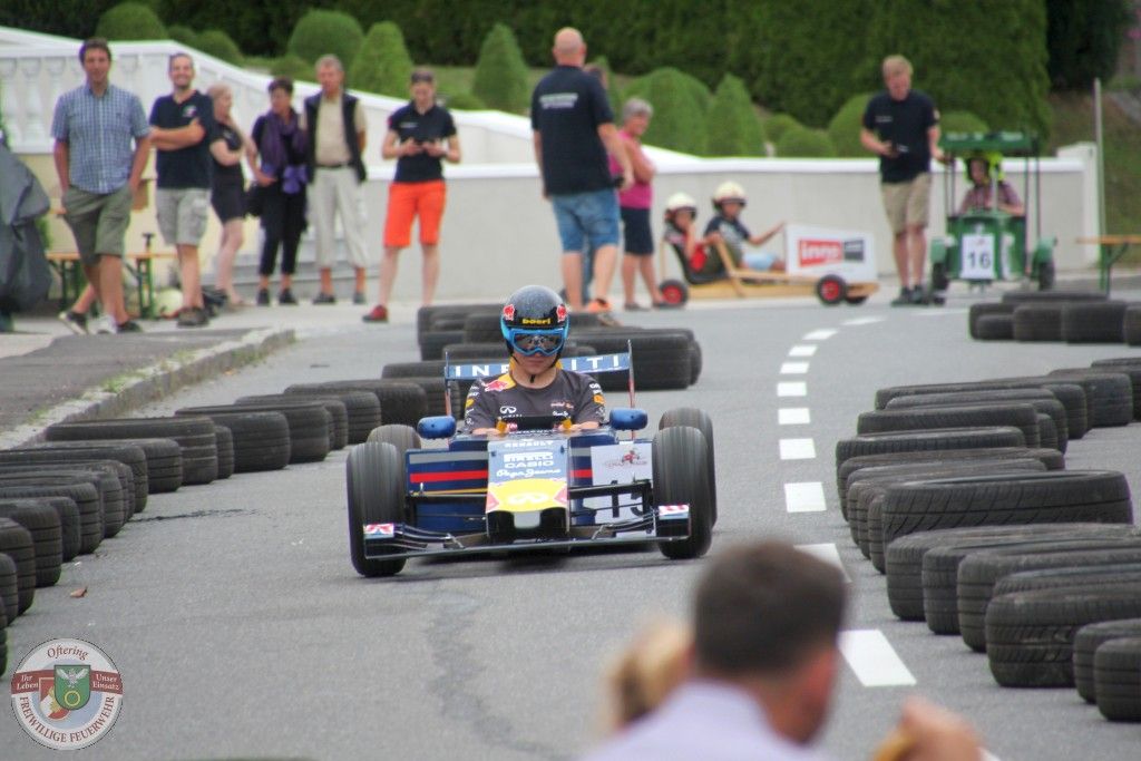 Um 15:00 Uhr traf das heurige Highlight ein - die Feuerwehr-Oldtimer. Insgesamt 12 Fahrzeuge schmückten die Strecke. Kurz nach 16:00 Uhr konnten die ersten Testläufe absolviert werden. Bis zu diesem Zeitpunkt hatten wir 11 Anmeldungen. Profi-Moderator Banky und Lokalmatador Reinhold hatten nun genug Zeit, um ihre Stimmbänder für das Rennen auf Höchstform zu bringen. Währenddessen wurde auch die unabhängige Jury gebildet: Bürgermeister Dietmar L., die Gemeinderäte Markus H. und Michael M., Obmann des Kameradschaftsbundes Oftering Alfons H., sowie E-ABI Erwin C. von den Feuerwehr-Oldtimern.