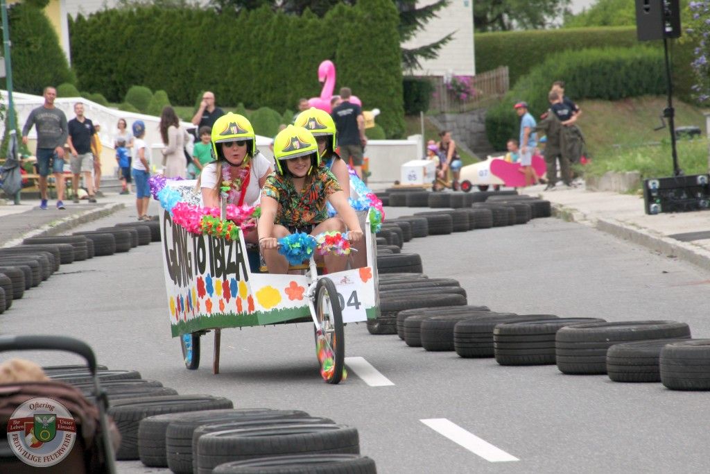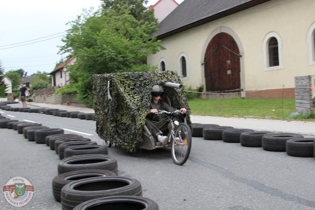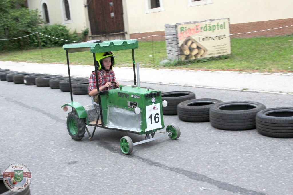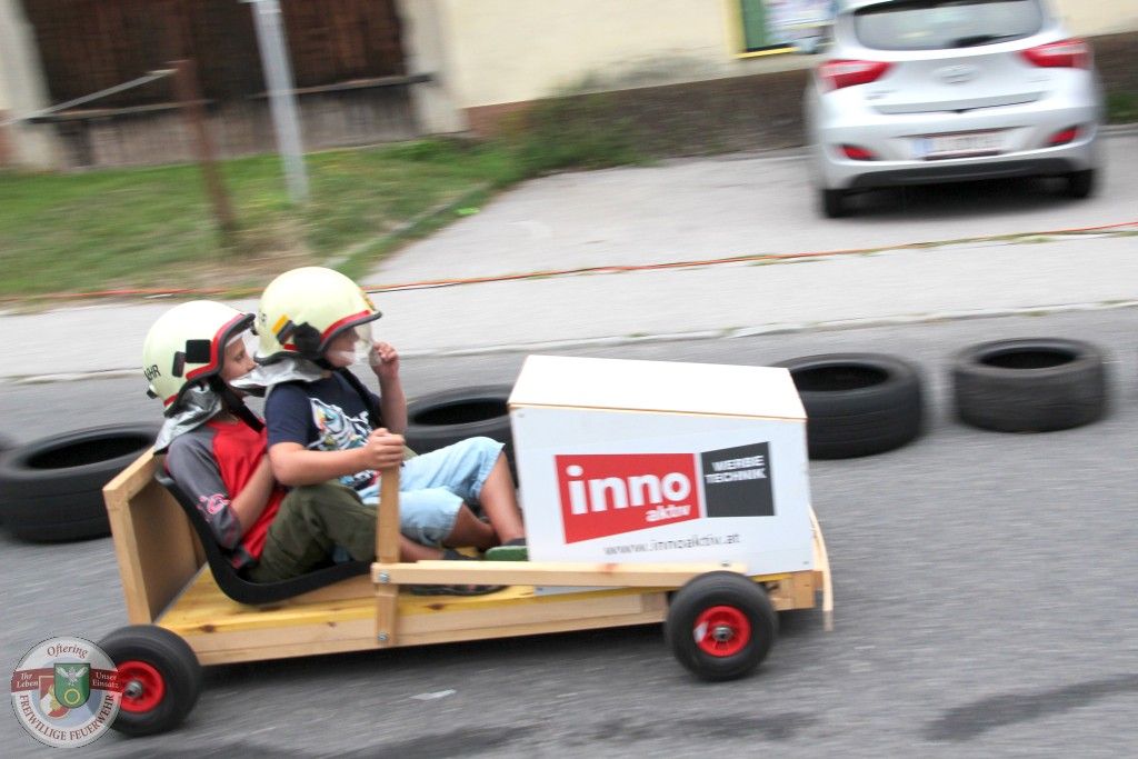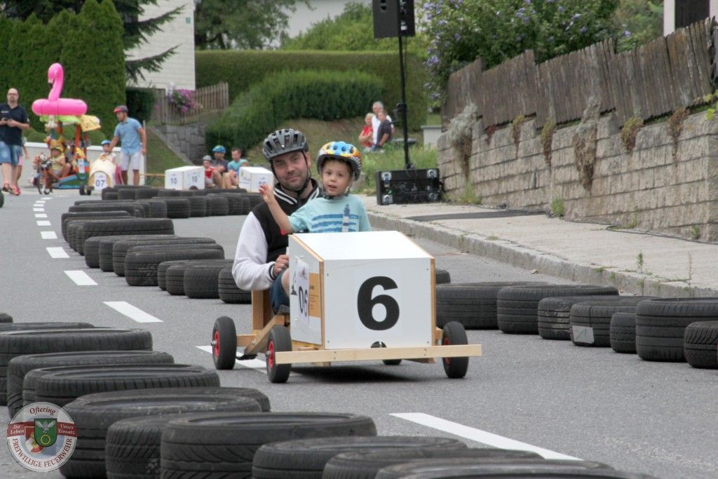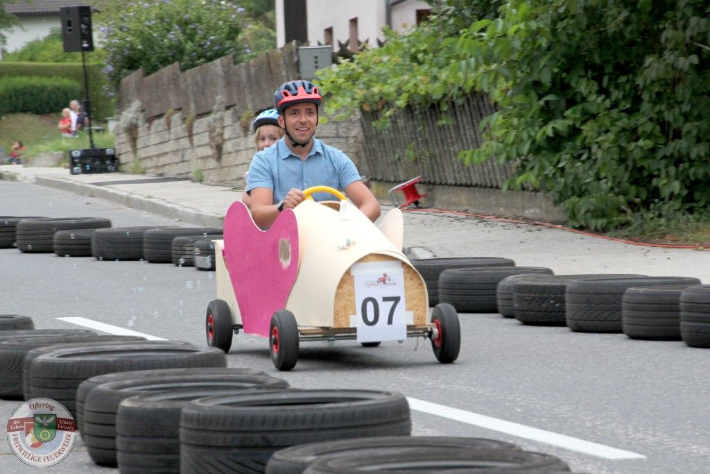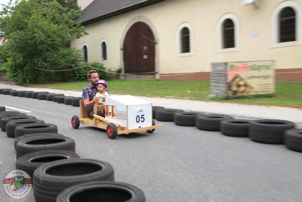 Um 15:00 Uhr traf das heurige Highlight ein - die Feuerwehr-Oldtimer. Insgesamt 12 Fahrzeuge schmückten die Strecke. Kurz nach 16:00 Uhr konnten die ersten Testläufe absolviert werden. Bis zu diesem Zeitpunkt hatten wir 11 Anmeldungen. Profi-Moderator Banky und Lokalmatador Reinhold hatten nun genug Zeit, um ihre Stimmbänder für das Rennen auf Höchstform zu bringen. Währenddessen wurde auch die unabhängige Jury gebildet: Bürgermeister Dietmar L., die Gemeinderäte Markus H. und Michael M., Obmann des Kameradschaftsbundes Oftering Alfons H., sowie E-ABI Erwin C. von den Feuerwehr-Oldtimern.