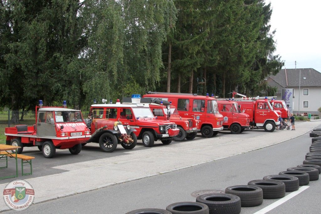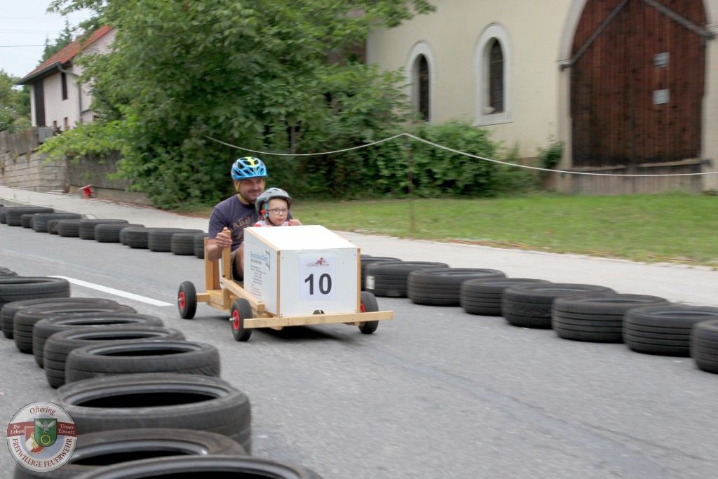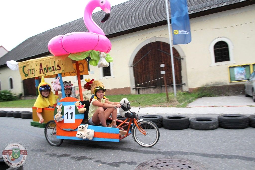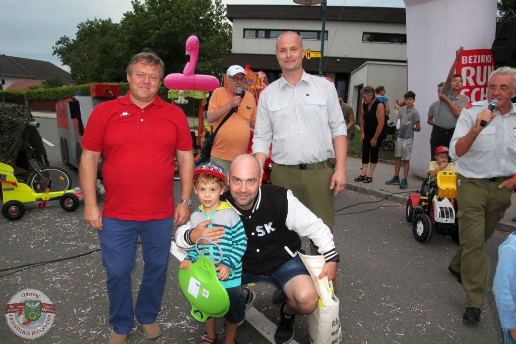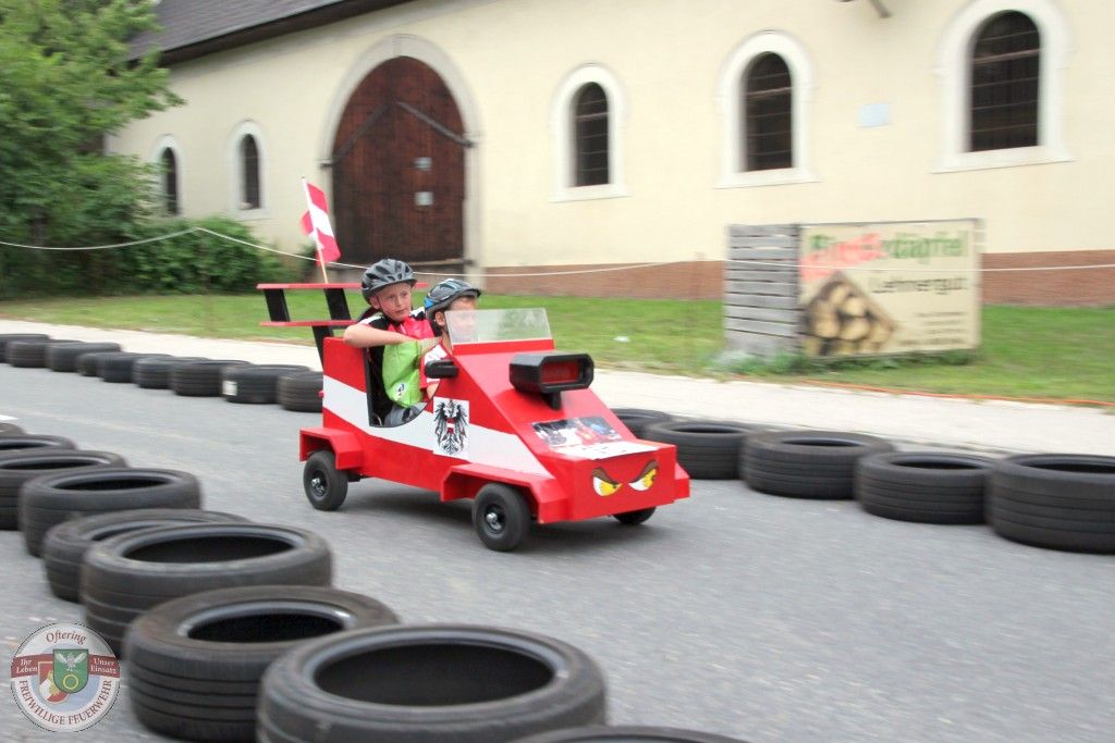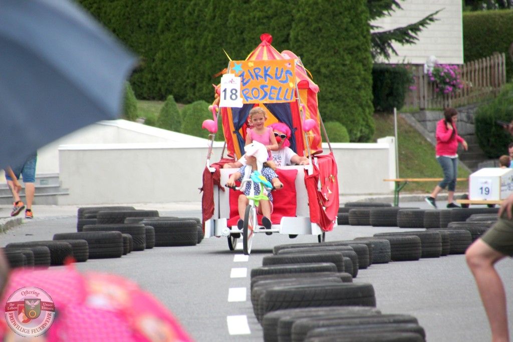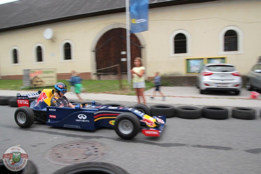 Um 15:00 Uhr traf das heurige Highlight ein - die Feuerwehr-Oldtimer. Insgesamt 12 Fahrzeuge schmückten die Strecke. Kurz nach 16:00 Uhr konnten die ersten Testläufe absolviert werden. Bis zu diesem Zeitpunkt hatten wir 11 Anmeldungen. Profi-Moderator Banky und Lokalmatador Reinhold hatten nun genug Zeit, um ihre Stimmbänder für das Rennen auf Höchstform zu bringen. Währenddessen wurde auch die unabhängige Jury gebildet: Bürgermeister Dietmar L., die Gemeinderäte Markus H. und Michael M., Obmann des Kameradschaftsbundes Oftering Alfons H., sowie E-ABI Erwin C. von den Feuerwehr-Oldtimern.
