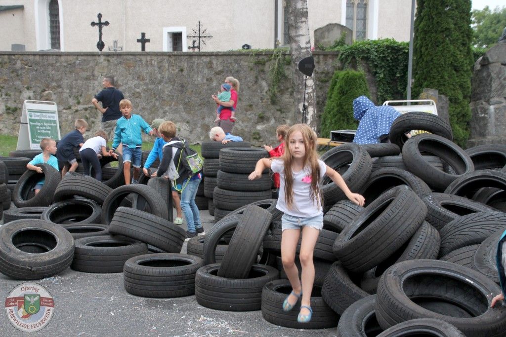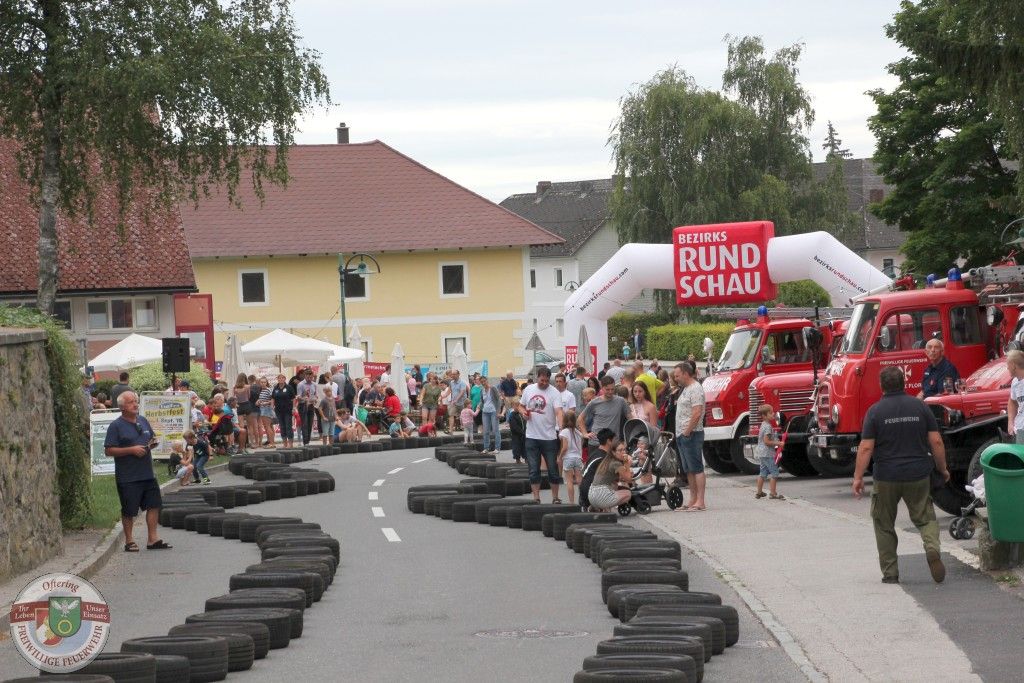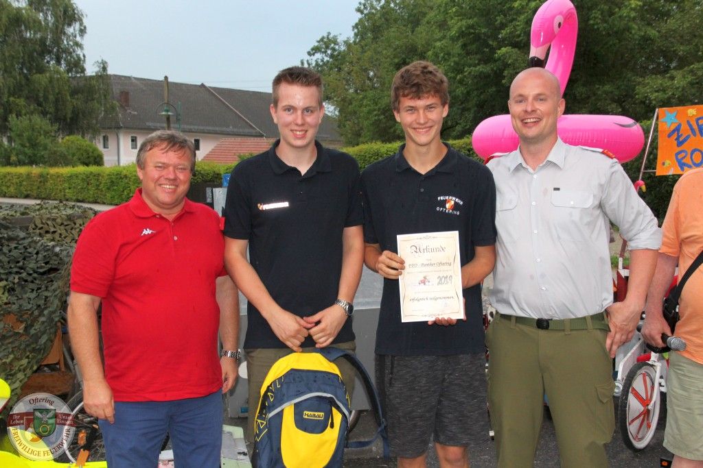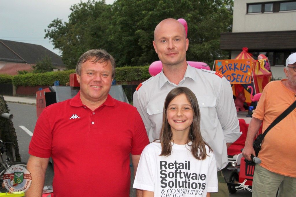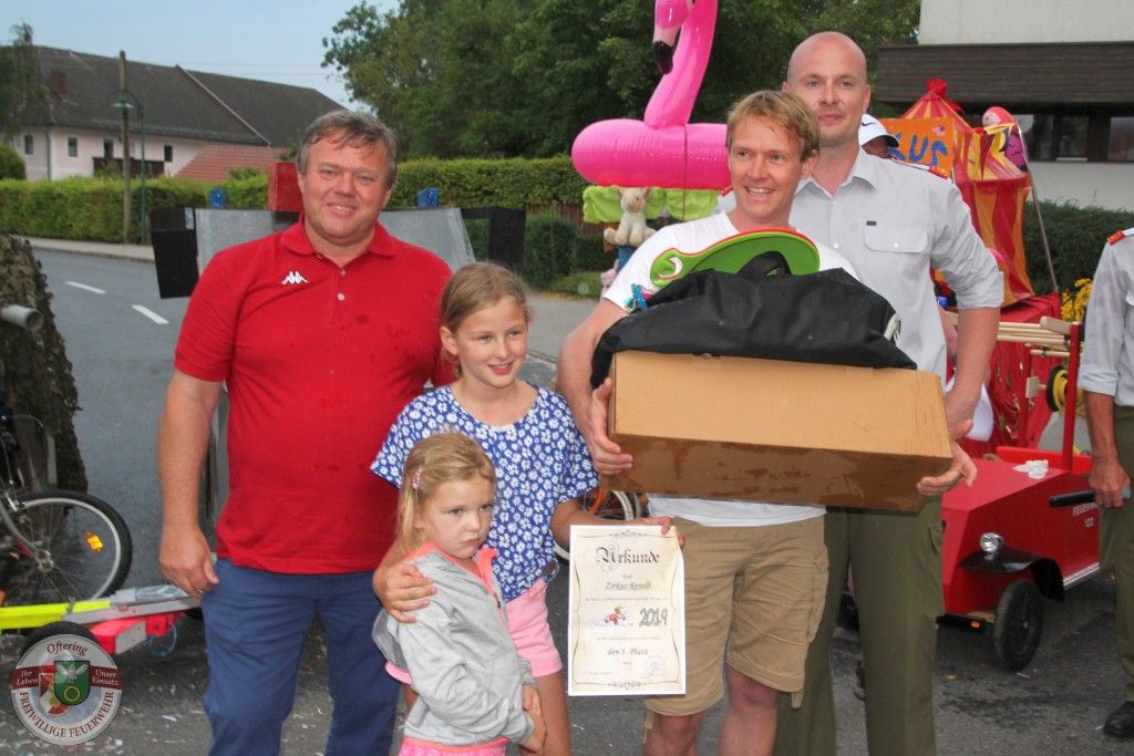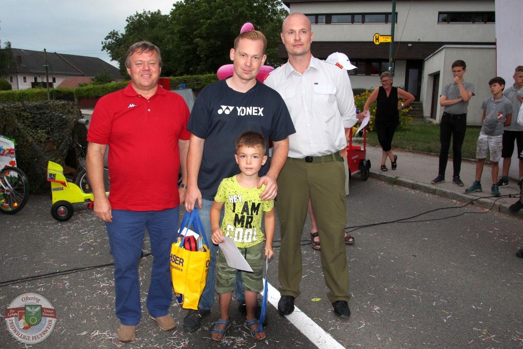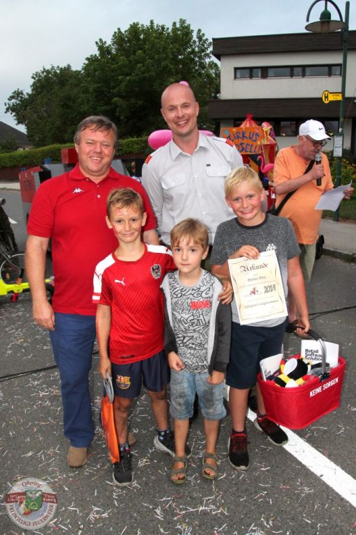 Um 15:00 Uhr traf das heurige Highlight ein - die Feuerwehr-Oldtimer. Insgesamt 12 Fahrzeuge schmückten die Strecke. Kurz nach 16:00 Uhr konnten die ersten Testläufe absolviert werden. Bis zu diesem Zeitpunkt hatten wir 11 Anmeldungen. Profi-Moderator Banky und Lokalmatador Reinhold hatten nun genug Zeit, um ihre Stimmbänder für das Rennen auf Höchstform zu bringen. Währenddessen wurde auch die unabhängige Jury gebildet: Bürgermeister Dietmar L., die Gemeinderäte Markus H. und Michael M., Obmann des Kameradschaftsbundes Oftering Alfons H., sowie E-ABI Erwin C. von den Feuerwehr-Oldtimern.